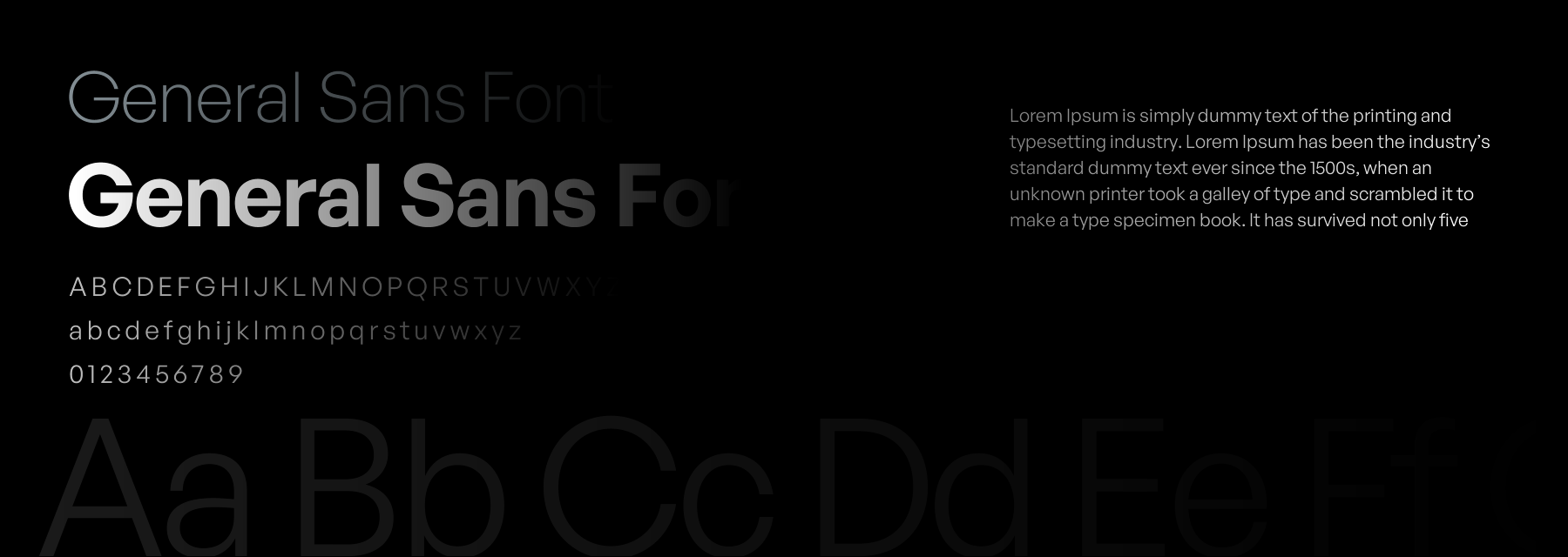 Tipografik omurga General Sans. Başlıklarda sakin ama kendinden emin bir ritim, gövdede yüksek okunurluk ve netlik. Nötr temel palet, tüm mecralarda berraklığı taşıyor: Siyah (Kömür) #111111 ve Beyaz #FFFFFF. Bu iki sabit, projelere ait vurgu renkleriyle birlikte billboard–web–dijital bütününde aynı “kentli minimalizm” duygusunu koruyor.
