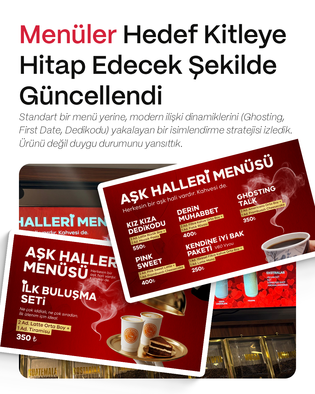 Standart bir menü, sadece ürünleri listeler. Deneyim odaklı bir menü ise duygulara ve durumlara hitap eder. Sevgililer Günü'nün getirdiği farklı ilişki dinamiklerini (yalnızlar, platonikler, yeni çiftler, dertleşen kankalar) kapsayacak şekilde, 1 ay sürecek özel bir menü kurgusu oluşturduk.